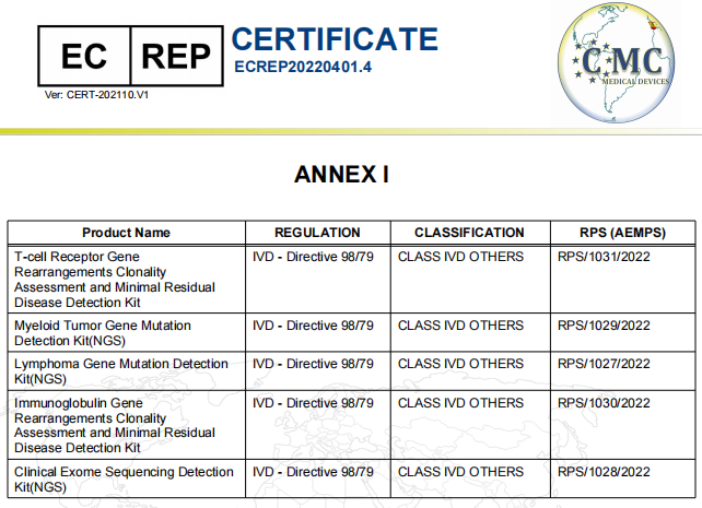近日,金年会集团控股子公司海希生物研发的九项血液肿瘤诊断产品,成功获得CE认证,意味着我司相关产品符合欧盟的法规要求,可在欧盟和认可欧盟CE认证的国家销售。这九项产品分别是: